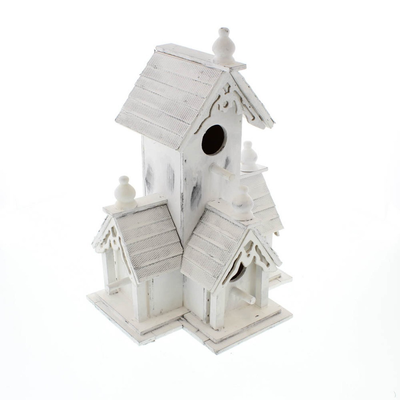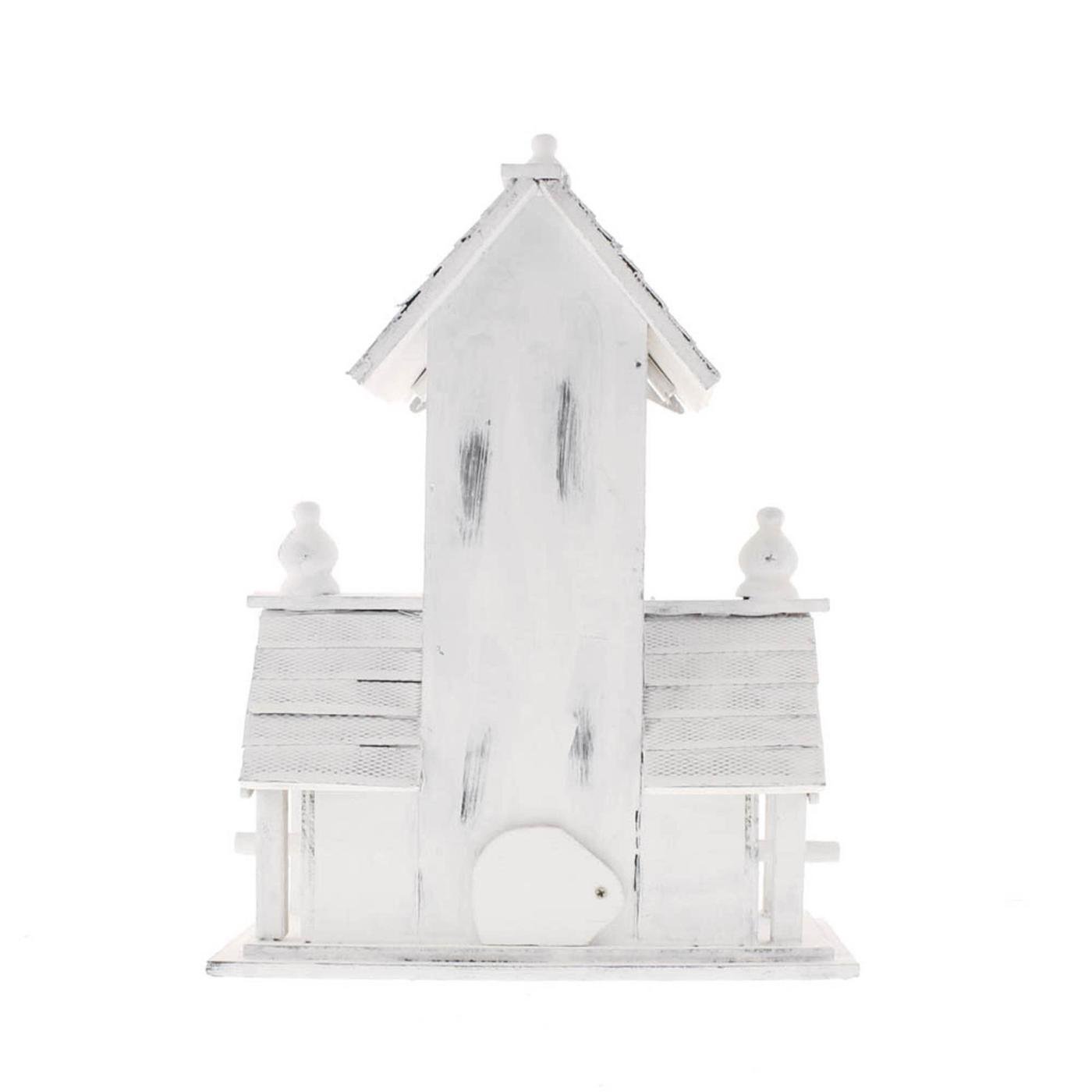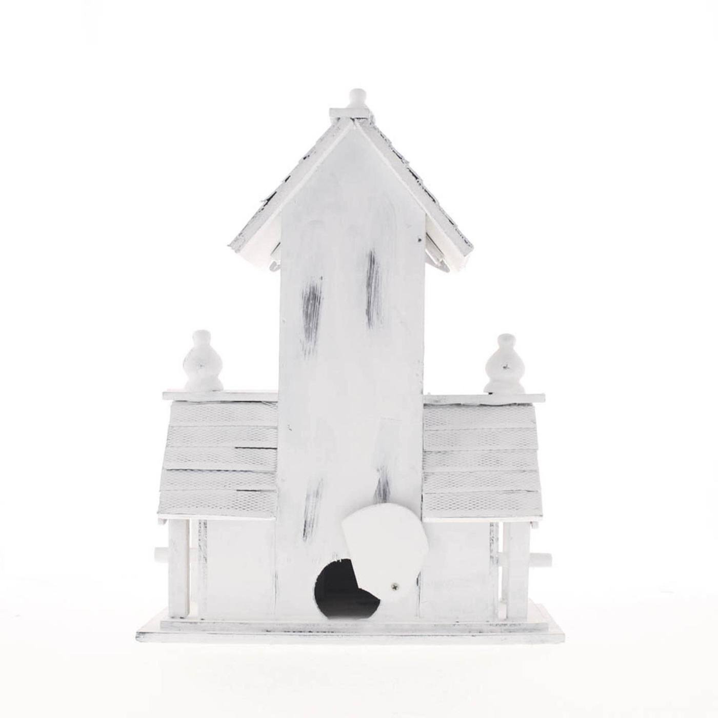 • Victorian-style birdhouse features distressed white-finished wood, multiple entrances, and detailed wood trim with an heirloom look.