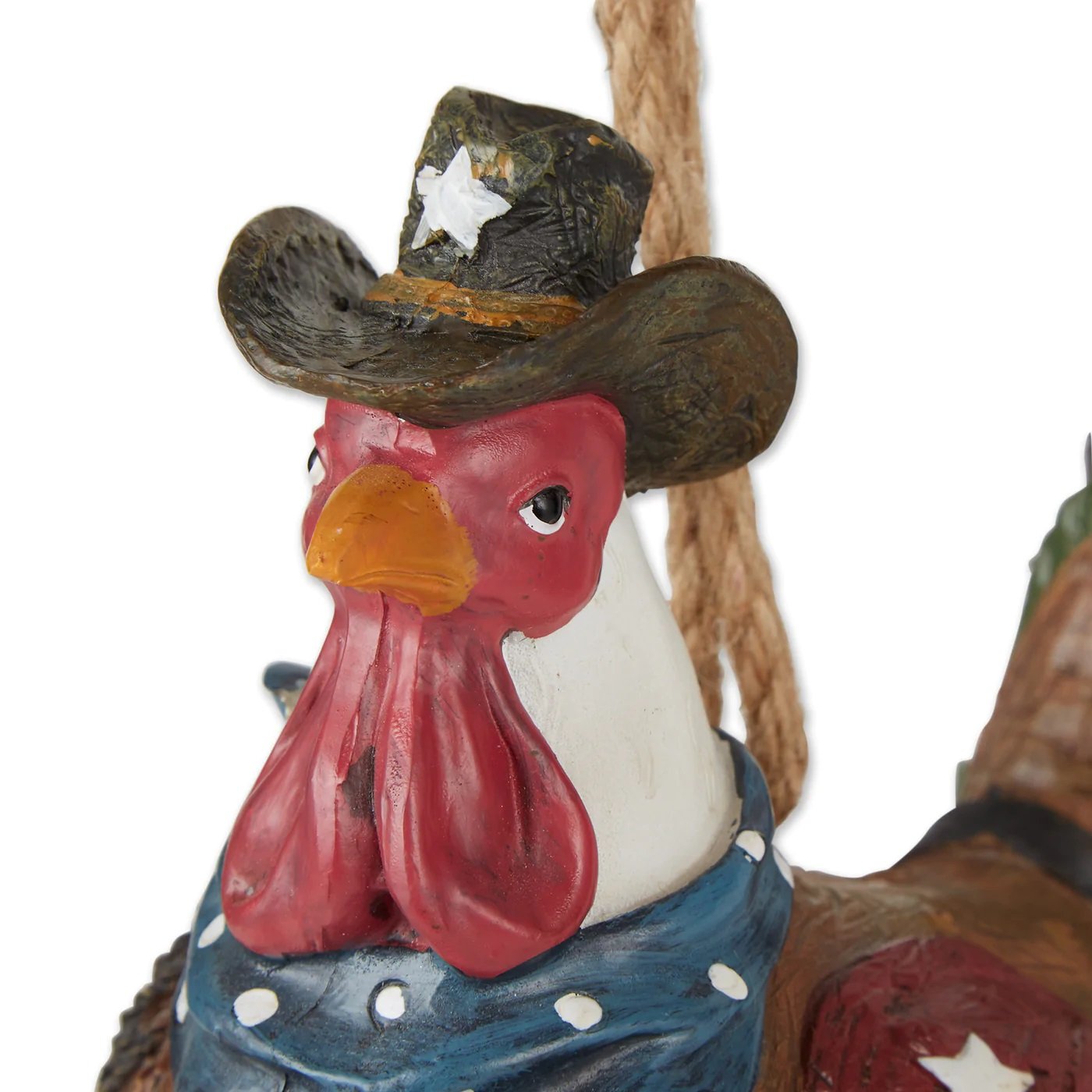 • All dressed up in his Western finery, a plump brown 'bucka-rooster' offers ample shelter to his fellow feathered friends. Free-swinging cowboy boot feet dance an amusing two-step in the slightest breeze!