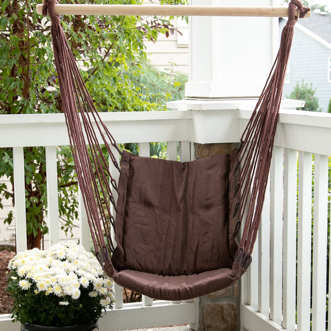 • This will be your favorite seat, indoors or out! Espresso-colored cushions held by matching rope and a wooden frame, all designed to give you a premium outdoor seat for relaxing as you sway with the summer breeze.