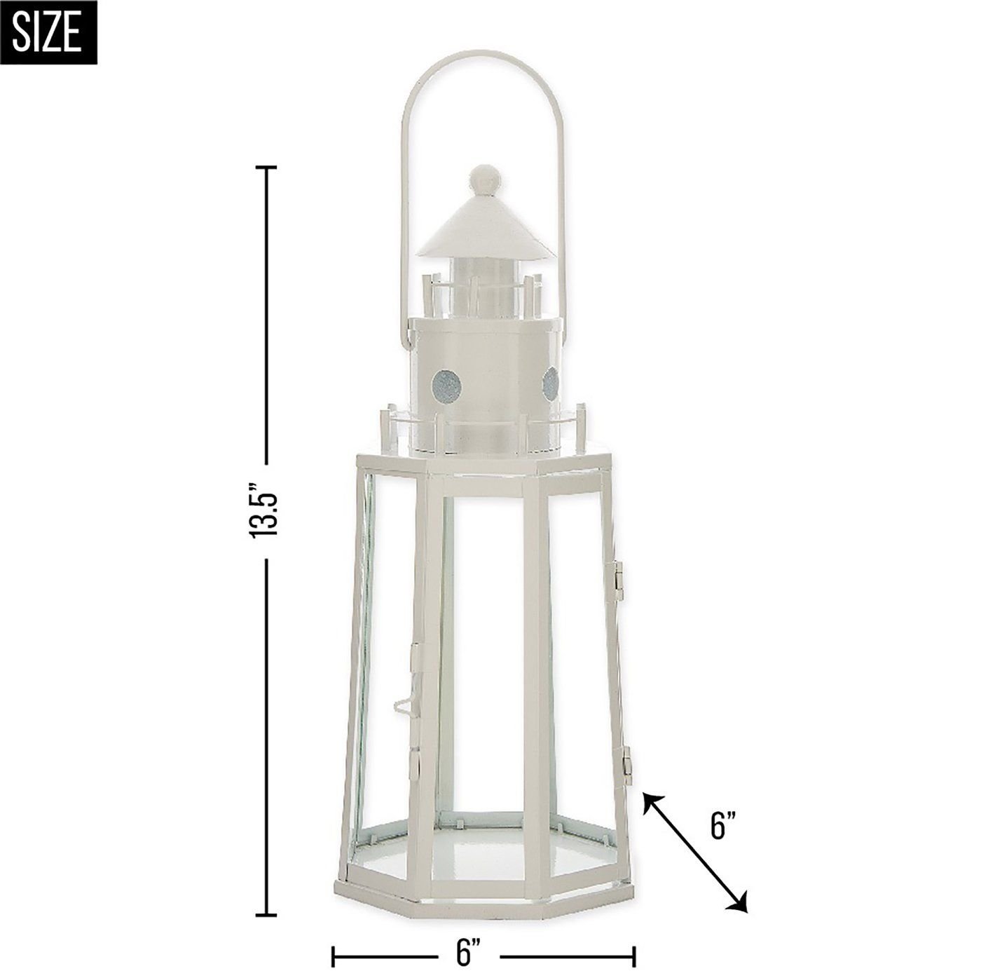 Decorate your home like a sleepy seaside village with this charming lighthouse lantern. With glass window panes, a contemporary galvanized metal top, and a metal handle for easy hanging this lantern is both sturdy and chic. Place a candle or LED of your choice inside the lantern to illuminate your space in a soft and serene glow. Use it to create a centerpiece for parties or special events, display on a countertop or coffee table, or to accent beach themed décor - available in a variety of styles and colors!